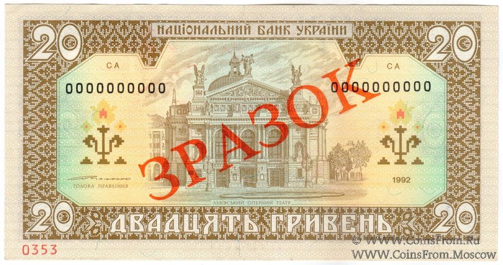 Выпуск 1992 г. ОБРАЗЕЦ (ЗРАЗОК) № 0353: диагональная надпечатка красного цвета "ЗРАЗОК" на аверсе и реверсе. Подпись - Ющенко.