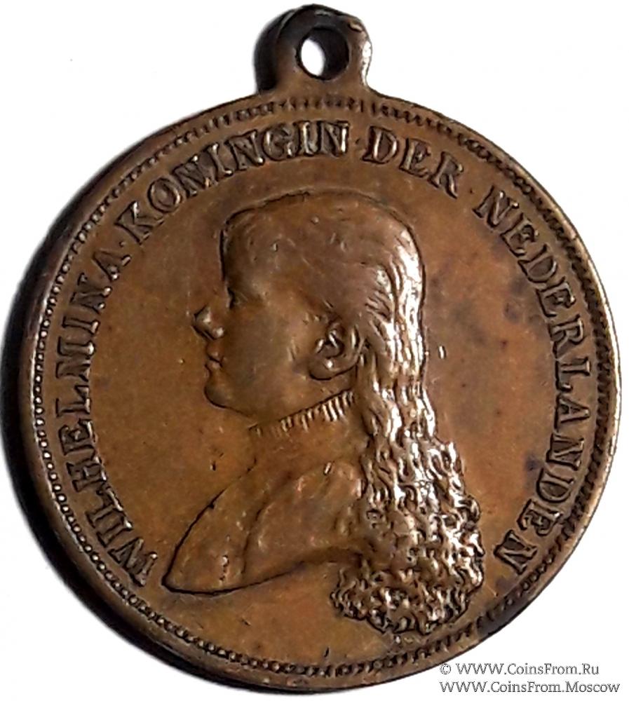 Памятная медаль Вильгельмина королева Нидерландов. Диаметр 29 мм. Вес 11,54 г.
