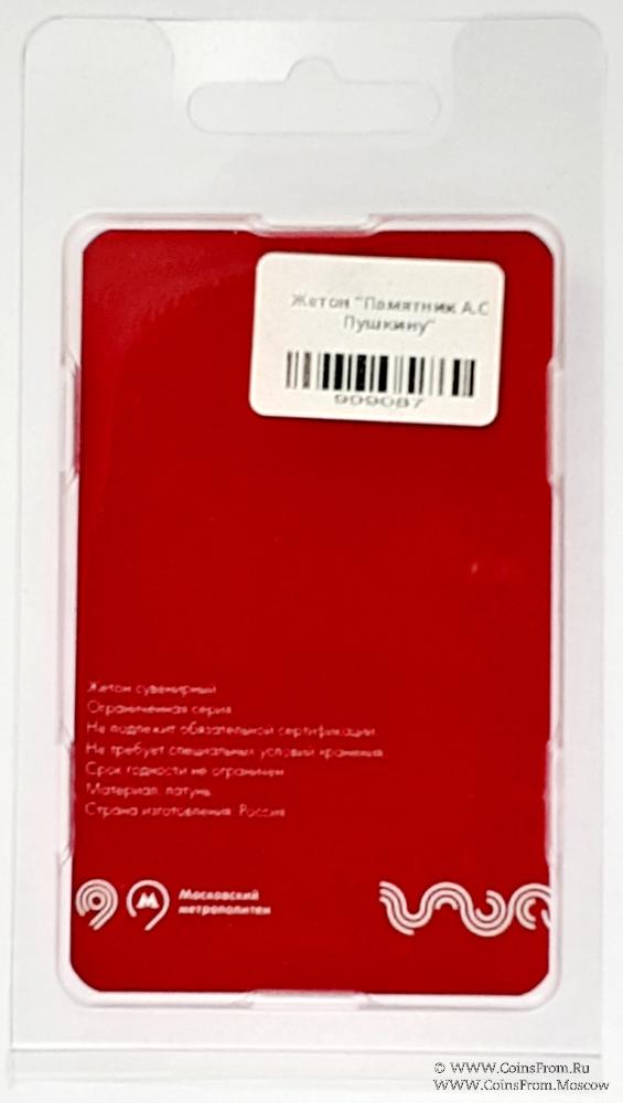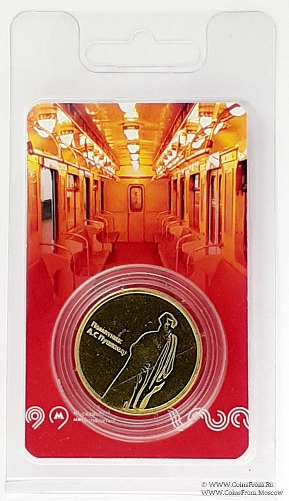 Жетон "Памятник А.С.Пушкину", ограниченная серия. Московский транспорт. Московский метрополитен. Жетон. Латунь. Размер: 32,6 мм х 2 мм.