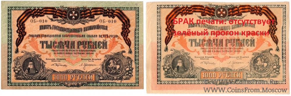 Билет Государственного Казначейства 1919 г. БРАК печати: недопечатка фона аверса (отсутствует зелёный прогон краски), без номера.