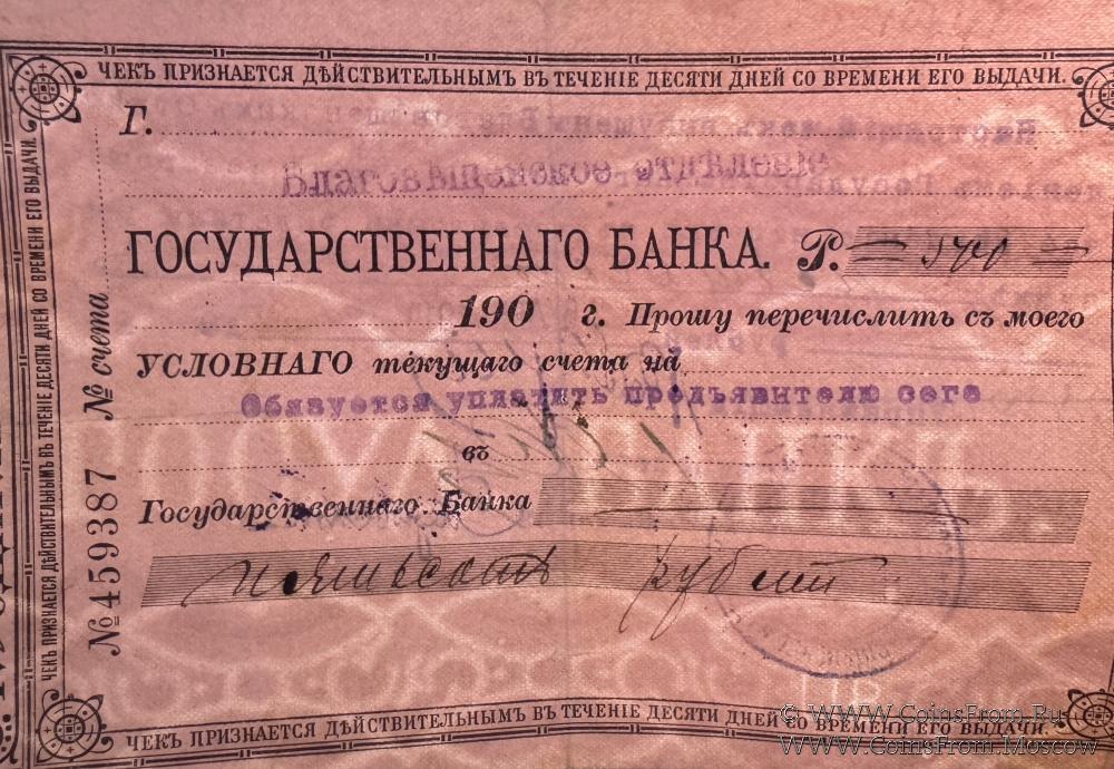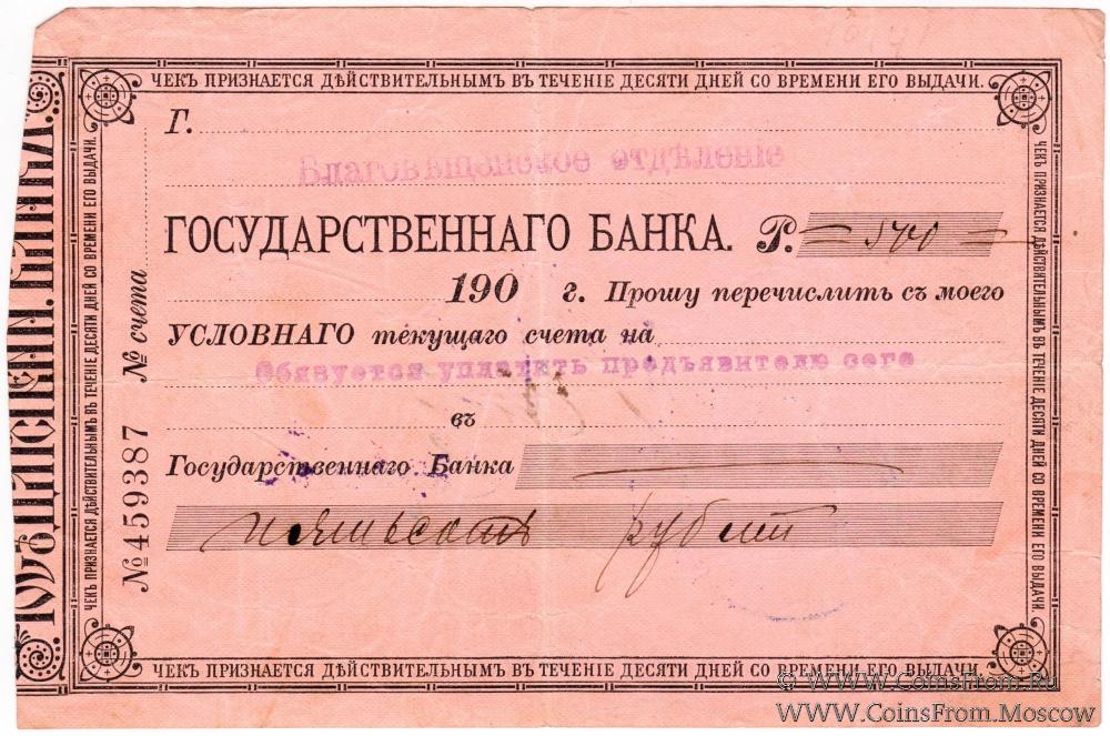 Чек 1919 г. С водяным знаком. Благовещенское Отделение Государственного Банка.
