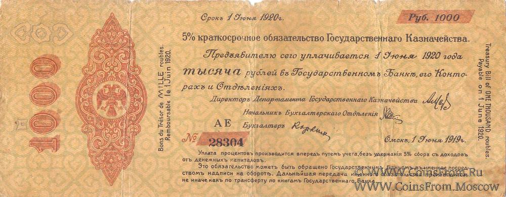 Выпуск 1 июня 1919 г. Серия АЕ. Номер 5-значный. 5% Краткосрочные Обязательства Государственного Казначейства.