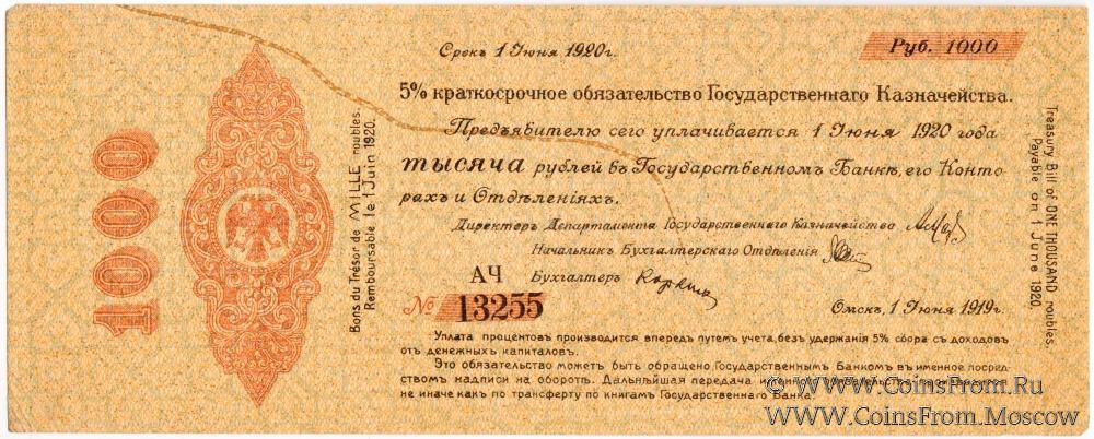 Выпуск 1 июня 1919 г. БРАК печати: полоса краски на аверсе. Серия АЧ. Номер 5-значный, крупный. 5% Краткосрочные Обязательства Государственного Казначейства.
