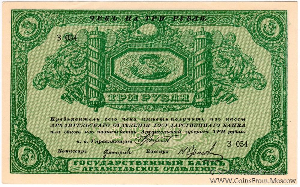 Чек 1918 г. (без даты). Серия - одна литера. Архангельское Отделение Государственного Банка.