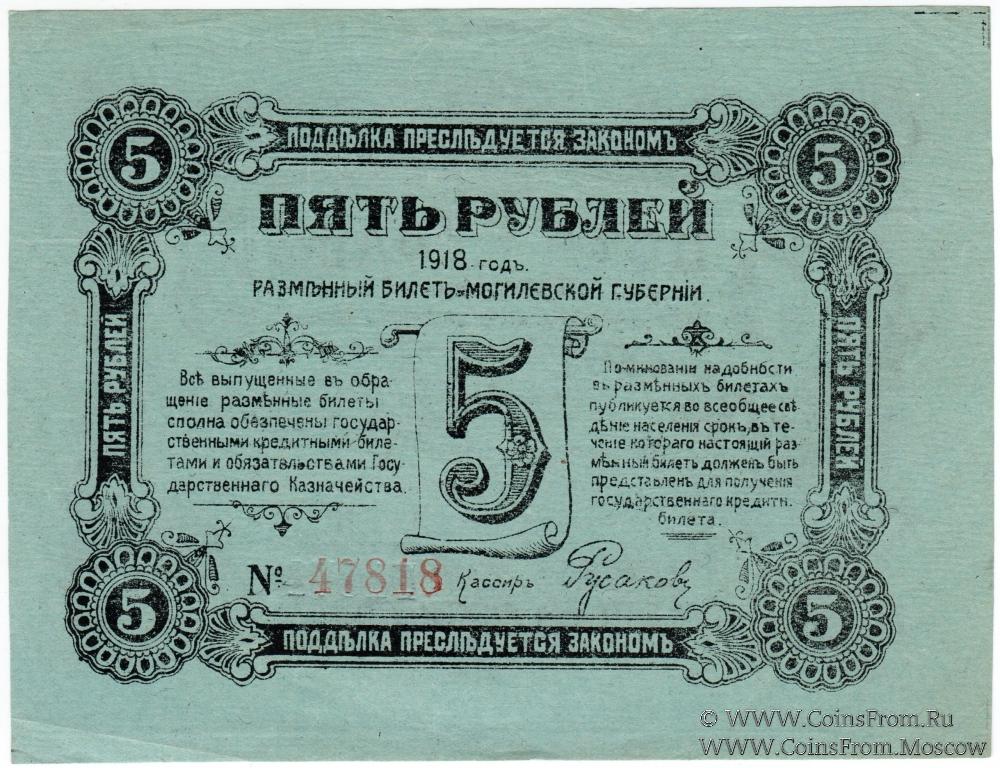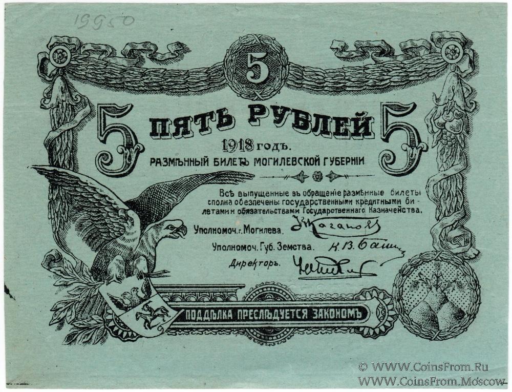 Разменный билет Могилевской губернии 1918 г. С номером (красного цвета) и подписью (факсимиле) на реверсе. Номер 5-значный. Губернская управа.