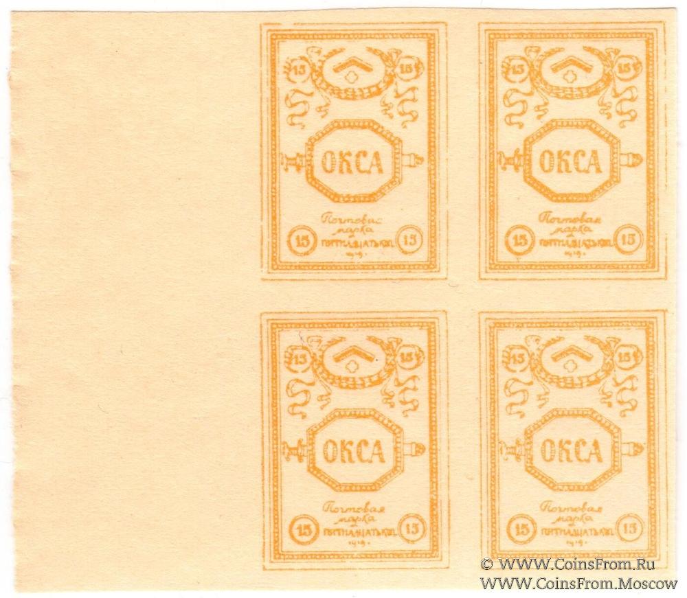 Почтовая марка ОКСА. Квартблок. Край листа. Аверс отдельно. Жёлтая.