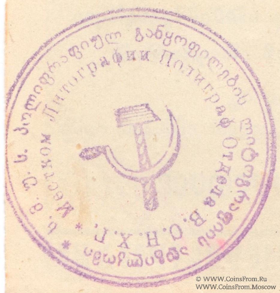 Печать круглая: Изображение серпа и молота (по центру) / "Местком Литографии Полиграф Отдела В.С.Н.Х.Г. *" (по кругу на двух языках: русском и грузинском).