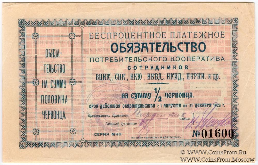 Беспроцентное платежное обязательство. Бумага жёлтая. Потребительский кооператив сотрудников ВЦИК, СНК, НКЮ, НКВД, НКИД, НКРКИ и др.