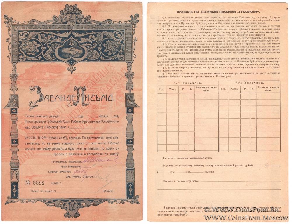 Заёмное письмо 1920 г. Серия Г. Бланк с подписями. Нижегородский Губернский Союз Рабоче-Крестьянских Потребительных Обществ (ГУБСОЮЗ).