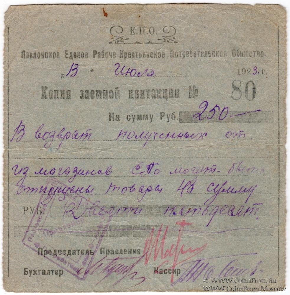 Печать ромбовидная: "Правление" (по центру) / "Павловское Городское Ед. Раб. - Кр. Потребительское О-во " (по периметру).