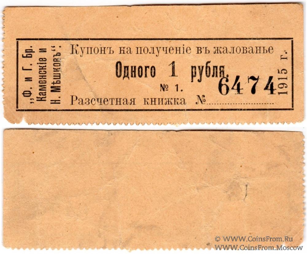 Купон на получение в жалованье. Зубцовка с 2-х сторон. Расчетная книжка № 6474. Ф. и Г. братья Каменские и Н. Мешков.