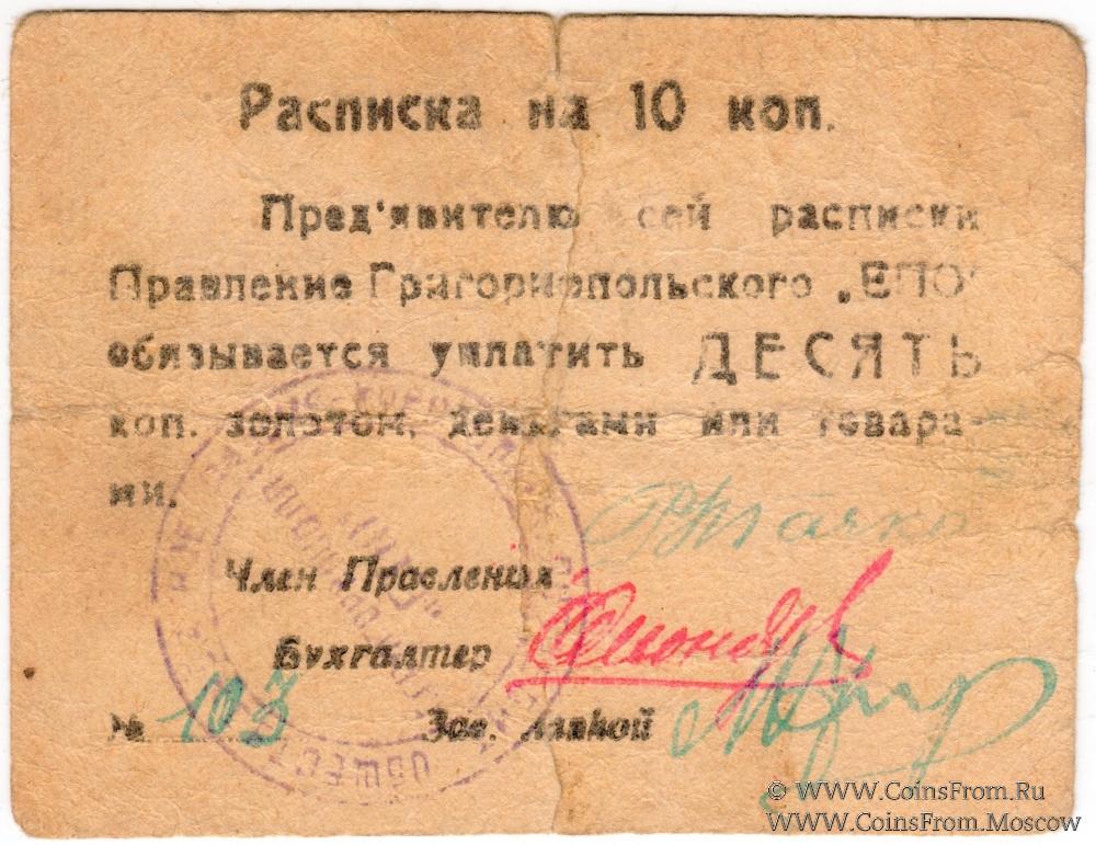 Печать круглая: "Г.ГРИГОРИОПОЛЯ "ЕПО"" (по центру в две строки) / "ЕДИНОЕ РАБОЧЕ-КРЕСТЬЯНСК. ПОТРЕБИТ. ОБЩЕСТВО *" (по кругу).