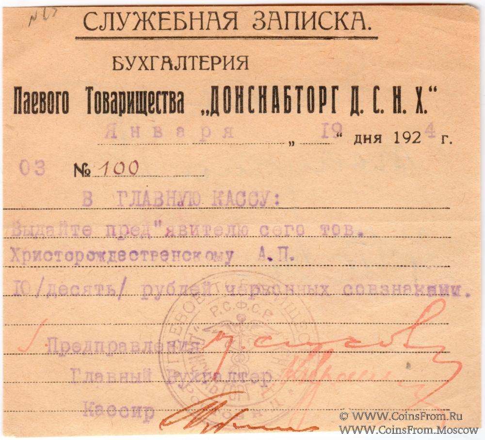 Печать круглая; "Р.С.Ф.С.Р. (Герб) ДОНСНАБТОРГ В.С.Н.Х. (по центру по кругу) / "ПАЕВОЕ ТОВАРИЩЕСТВО * Ростов н. Д. * " (по внешнему кругу)