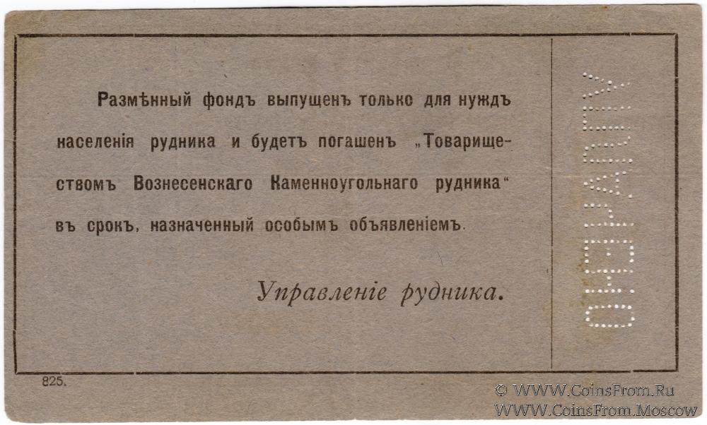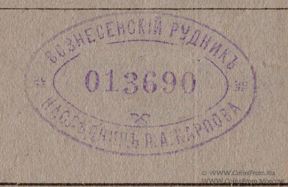 Разменный фонд. Перфорация "УПЛАЧЕНО", овальная печать на аверсе. Товарищество на паях Вознесенского Каменноугольного рудника наследниц П.А. Карпова.