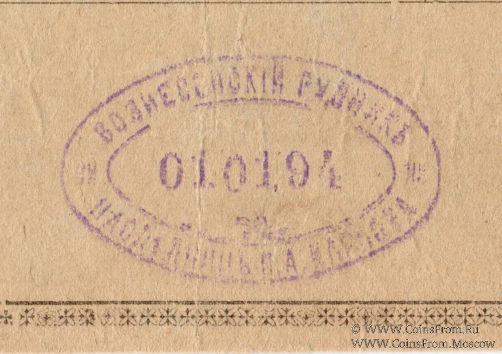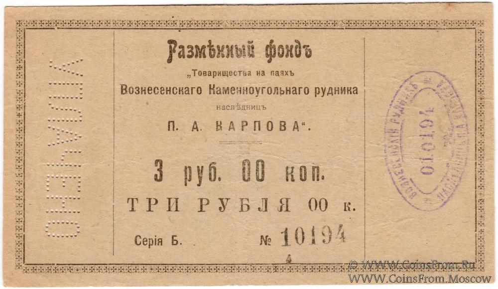 Разменный фонд. Перфорация "УПЛАЧЕНО", овальная печать на аверсе. Товарищество на паях Вознесенского Каменноугольного рудника наследниц П.А. Карпова.
