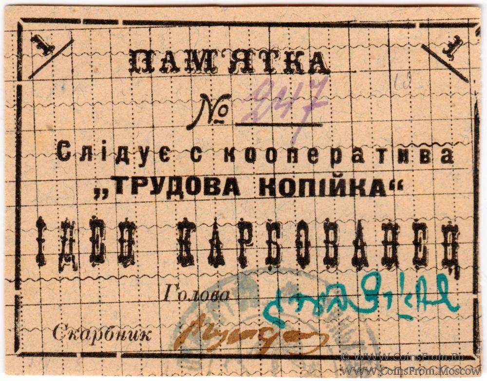 Печать круглая: "ЗИНЬКОВСКОЕ ОБЩЕСТВО ПОТРЕБИТЕЛЕЙ *" (по кругу) / "Трудовая / Копейка" (по центру в две строки).