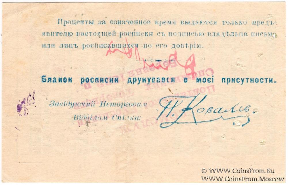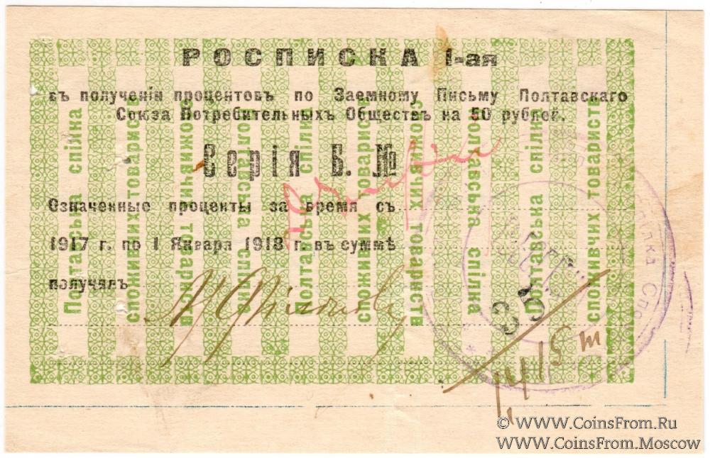 1-ая Расписка (Росписка) 1917 (1922) г. Серия Б. На аверсе номер штампом, сумма прописью (1.415.000) от руки, печать фиолетовая, подпись красная. На реверсе штамп 1922 г., текст синий. Полтавский Союз Потребительских Обществ (Полтавська спiлка споживчих товариств).