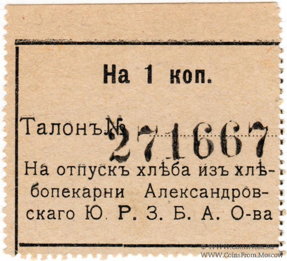 Талон без даты. Перфорация с 3-х сторон. Хлебопекарня Александровского Ю.Р.З.Б.А.О-ва.
