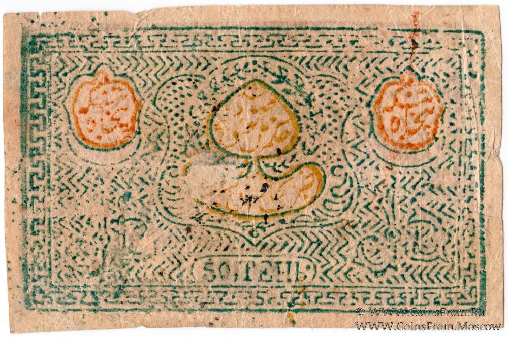 Бумажные деньги. 50 теньгов 1920 (1338) г. (новый тип). Бумага белая, верже. Зелёный оттенок аверса. Печати-подписи в круге.
