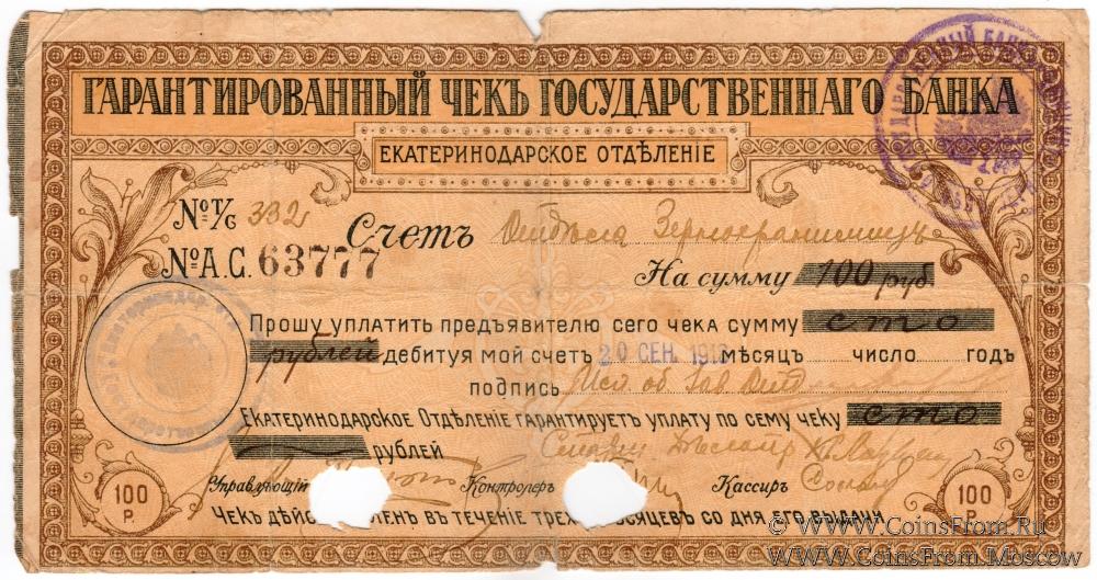 Печать: малый орел, текст: "Екатеринодар.отд. * Государственный Банкъ *".