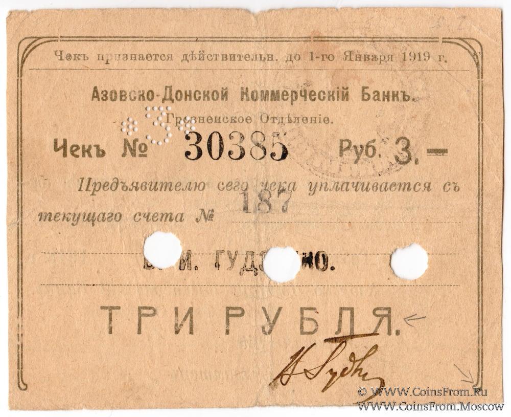 Чек 1918 г. Действителен до 1 января 1919 г. Перфорация "*3*". Гашение. Азовско-Донской Коммерческий Банк.