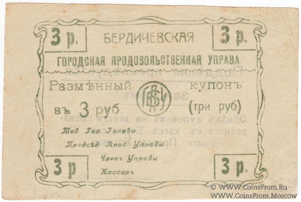 Разменный купон 3 рубля 1918 г. Бланк. Бердичевская городская продовольственная управа.