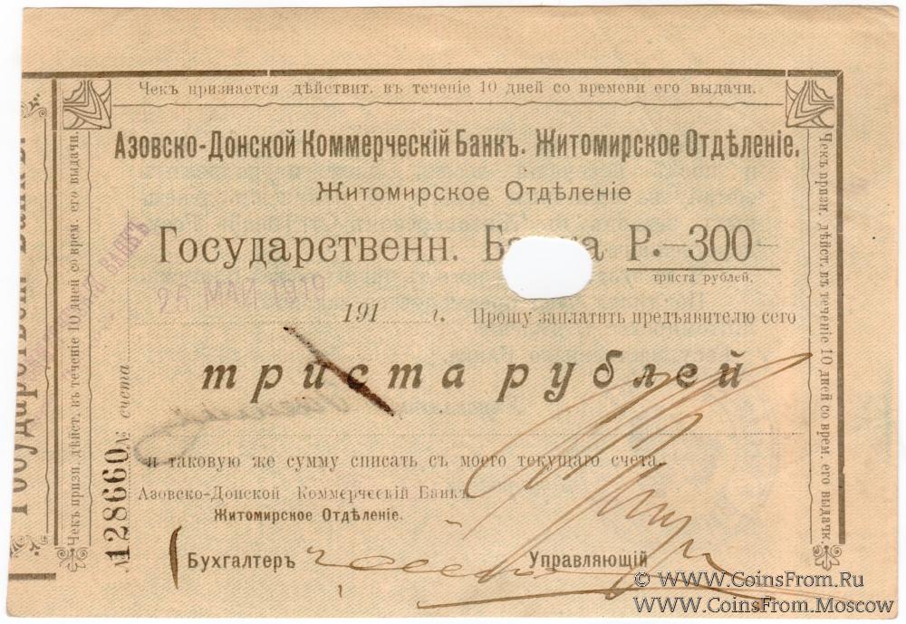 Чек 1919 г. Дата (25.05.1919) штампом. Номер 6-значный черный. Гашение. Рамка - Вариант 2. Надпись шире. Печать - орел без корон. Без водяных знаков. Житомирское отделение. Азовско-Донской коммерческий Банк. Государственный Банк.