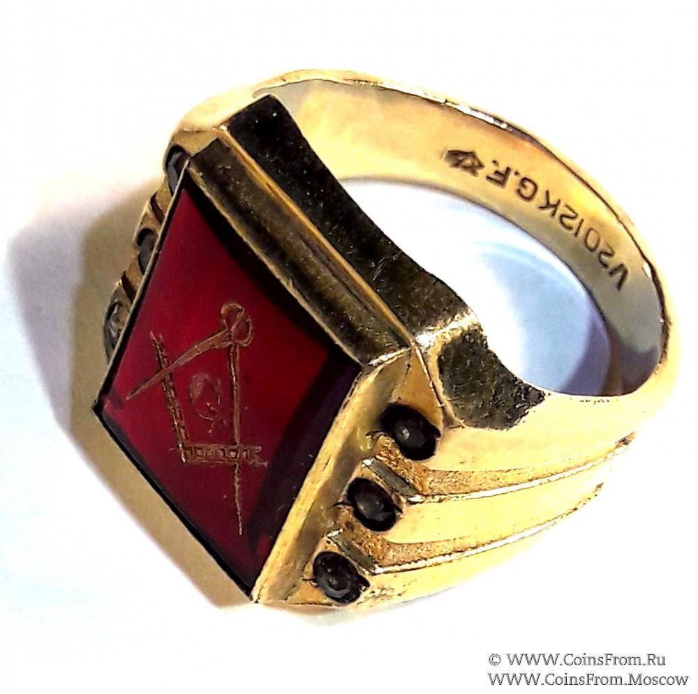 Перстень жёлтого металла с 1 большим и 6 малыми крвсеыми камнями