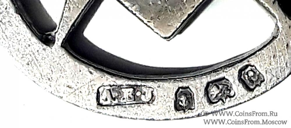Подвеска в форме круга, образованного венком с кольцом для крепления. В центре круга Наугольник с тремя точками и циркуль. Обе ножки циркуля поверх наугольника - Мастер.