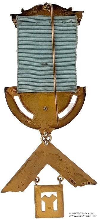 ЗНАК: серебро, позолота, эмаль.АВЕРС: знак из двух частей. Нижняя часть - в форме наугольника с подвеской квадратной формы, отображающей символическое изображение чертежа к 47 теореме из первой книги Евклида (теорема Пифагора). Наугольник равносторонний, украшенный гравировкой орнамента по периметру. Верхняя часть, выполняющая так же роль нижней колодки, в форме круга с картиной по эмали, обрамлённого снизу лентой с наименованием и номером Ложи.РЕВЕРС: клейма: наугольник – TK&S, якорь, лев, Y (1973). Гравировка: Presented to W. Bro. T. Moorcroft W.M. 1956-57.КОЛОДКИ/МЕДАЛЬОН: верхняя колодка в виде двух прямоугольников с надписью на латыни: Undecimus, наименованием должности (W.M.) и даты 1956-57. Верх колодки украшен орнаментом.ЛЕНТА: голубая. Ширина 32 мм.