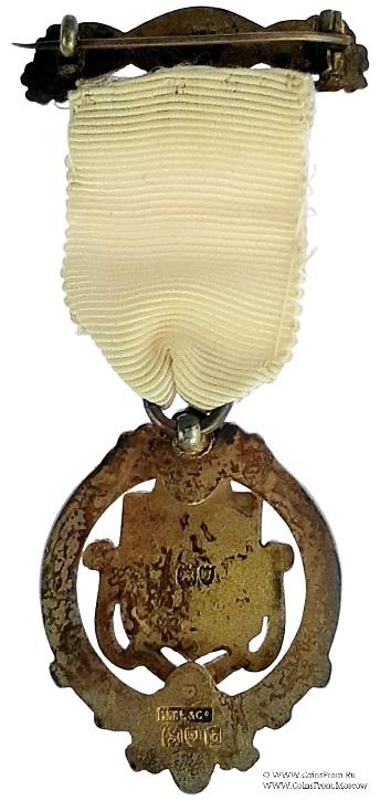 КОЛОДКИ/МЕДАЛЬОН: верхняя колодка в виде двух пересекающихся лент по бокам украшенных трилистниками. На белой ленте надпись Steward. На синей - дата 1915.
