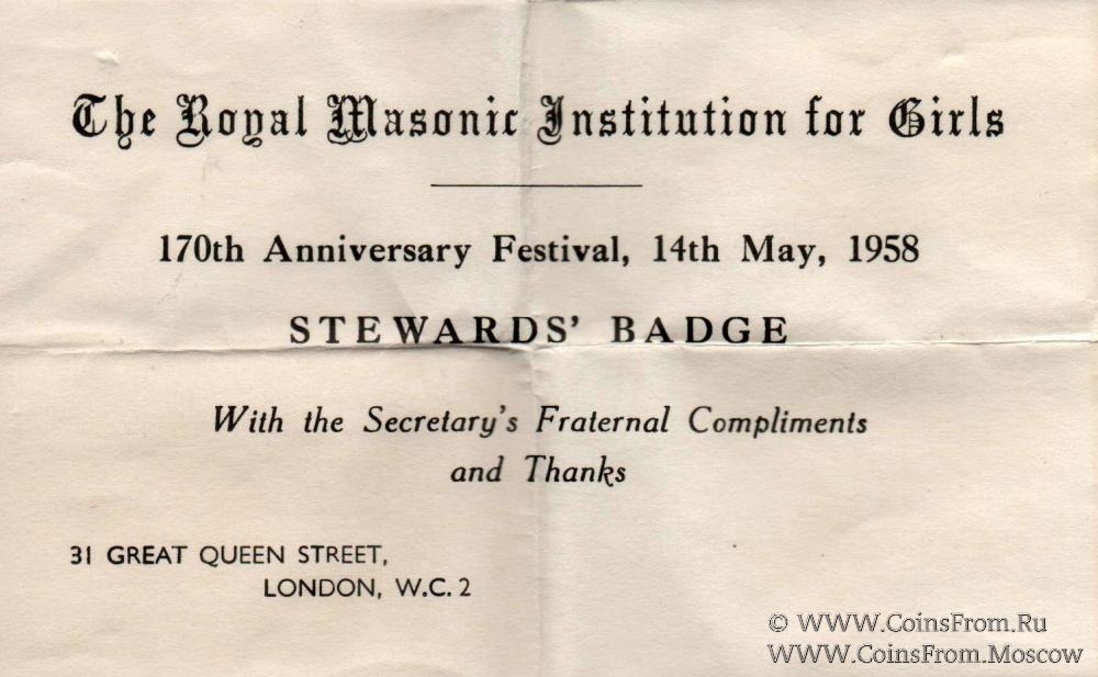 Знак RMIG 1981. STEWARD ROYAL MASONIC INSTITUTION FOR GIRLS – Королевский Масонский институт для девочек.