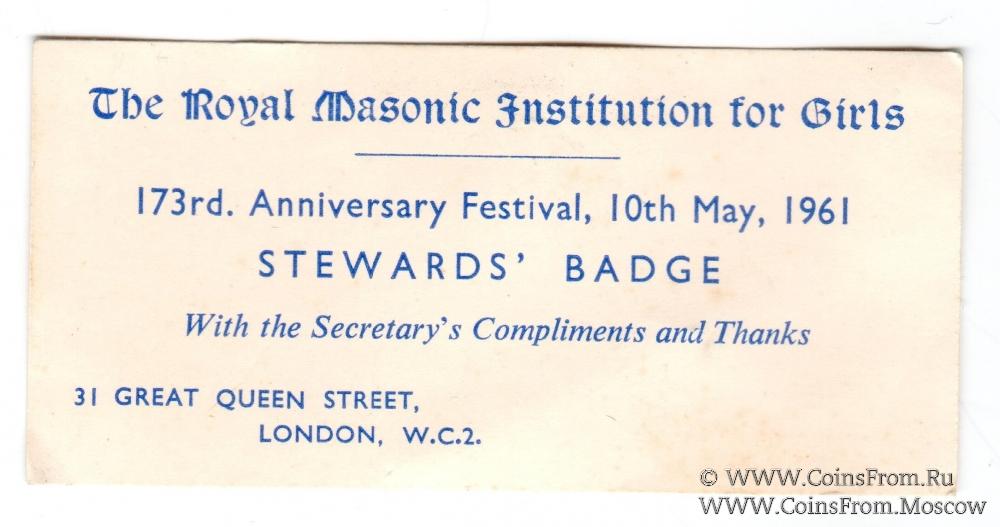 Колодки/медальон: верхняя колодка в виде изогнутой ленты белой эмали с надписью STEWARD, датой 1961 и булавкой для носки с обратной стороны. Ниже ленты двойной круг синей эмали с наименованием провинции, в центре которого изображение наугольника, циркуля и звезды.