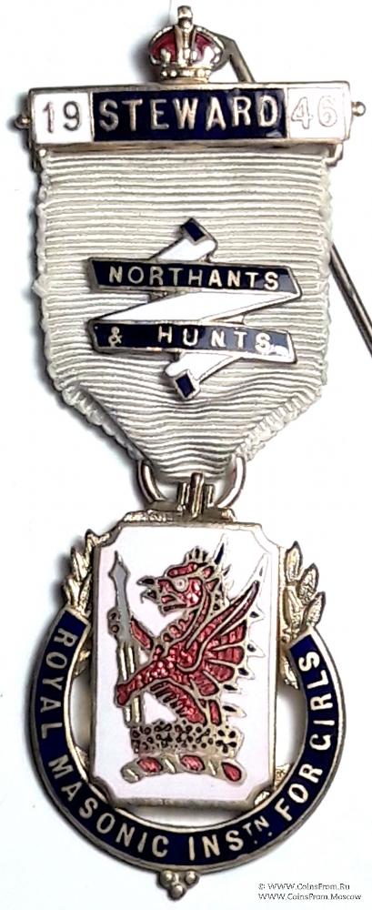 Знак в виде малого герба прямоугольной формы с изображением красного грифона на бурлете. Вокруг лента чёрной эмали с наименованием института ROYAL MASONIC INSTITUTION FOR GIRLS – Королевский Масонский институт для девочек. Лента знака белая. В центре ленты медальон в виде ленты с наименованием. Верхняя колодка с надписью STEWARD и датой 1946.
