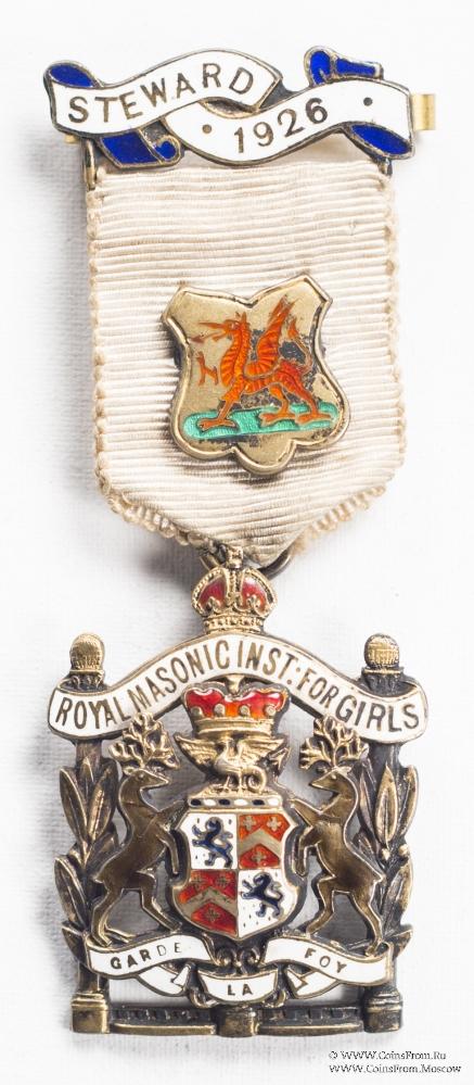 Цвет ленты белый. В центре ленты медальон в форме малого герба в виде щита с красным драконом на зелёном поле - символ Уэльса. (Страна, одна из четырёх главных административно-политических частей Соединённого Королевства Великобритании и Северной Ирландии, в прошлом конгломерат независимых кельтских королевств. Уэльс расположен на юго-западе Великобритании). Верхняя колодка в виде ленты сине-белой эмали с надписью STEWARD 1926 и булавкой для ношения с обратной стороны. В низу лента непосредственно, без металлической колодки, соединена с кольцом знака.