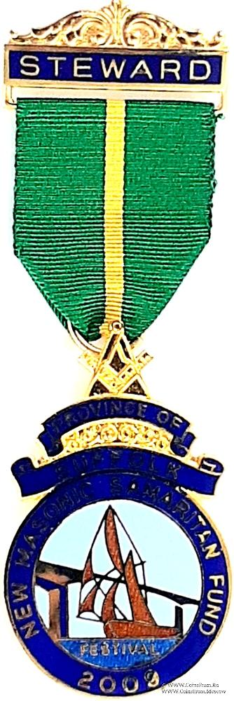 АВЕРС: двойной круг синей эмали с наименованием фонда и датой New Masonic Samaritan Fund 2009. В центре рисунок по эмали изображающий яхту на фоне моста и надпись Festival. Верх знака украшен лентой синей эмали с наименованием провинции Province of Suffolk (графство на востоке Англии) и циркулем с наугольником.