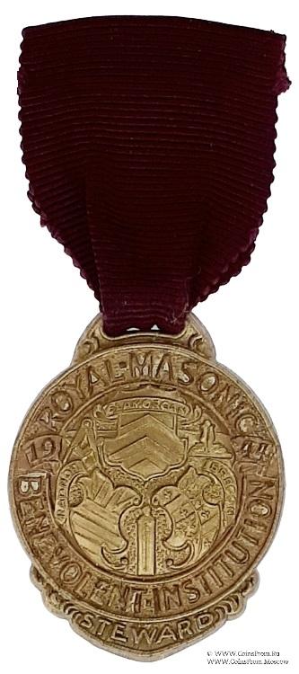 АВЕРС: в форме двойного круга с наименованием благотворительного заведения. В центре круга размещены три щита с девизными лентами и символика масонов: циркуль с наугольником, отвес, уровень (ватерпас). В верхней части круга на поперечной ленте слева и справа дата 19 44. Низ знака украшен пластиной с надписью Steward.