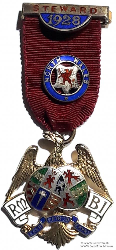 Колодки/медальон: верхняя колодка в виде прямоугольника с надписью STEWARD. Ниже в сегменте круга на синей эмали дата 1928. В центре ленты круглый медальон с элементами герба и надписью в двойном круге NORTH WALES - северный Уэльс.