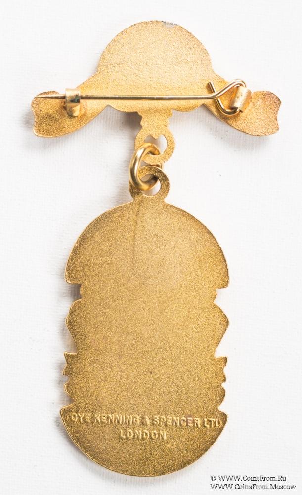 Знак овальной формы представляет собой герб, выполненный с применением множества геральдических фигур и способов их отображения. Щит скошенный справа наполовину белый, наполовину золотой. В средней точке главы выделено уменьшенное изображение поднятой красной правой ладони. Слева и справа от почётной точки и в средней точке основания щита изображены поднятые красные ладони правой руки – символ Ольстера (одна из четырёх исторических провинций Ирландии). Сверху щита шлем, над которым в качестве клейнода использована голова мужчины. В качестве намёта использованы стилизованные ленты и листья. С верху и с низу герб ограничен лентами красной эмали в форме полукруга с надписями на латыни LOYAL AU MORT и MANIBUS VICTORIA DEXTRIS.