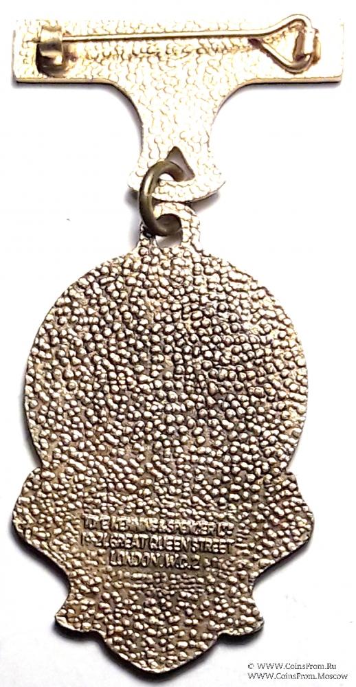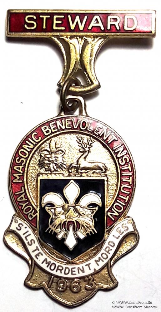 Знак круглой формы. В нижней части знака малый герб в виде щита со стилизованным изображением головы леопарда и трилистником на чёрном фоне. Сверху на щите на бурлетах размещены два клейнода: лежащий олень и голова леопарда с трилистником. По кругу в красной эмали наименование института ROYAL MASONIC BENEVOLENT INSTITUTION – Королевский Масонский Благотворительный институт. Ниже герба на ленте белой эмали девиз на латыни. Под девизом на шиите в виде трилистника дата 1963.