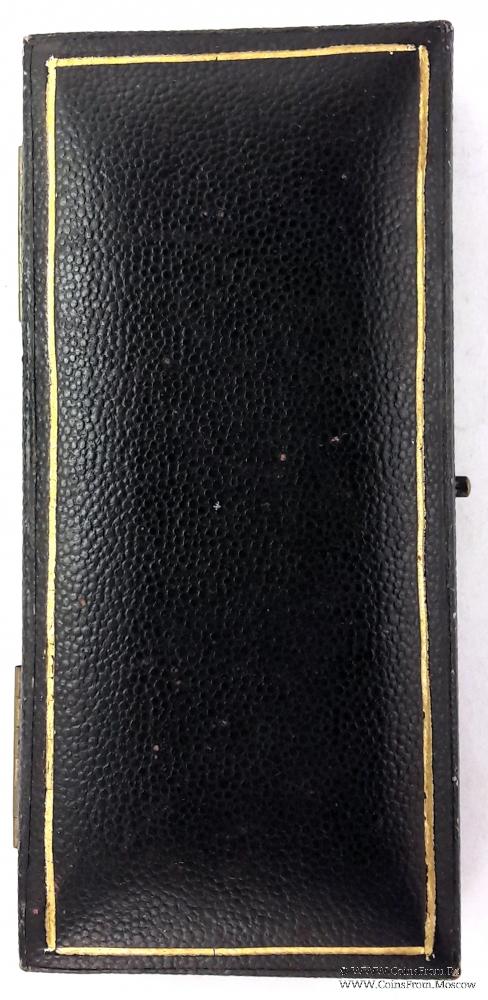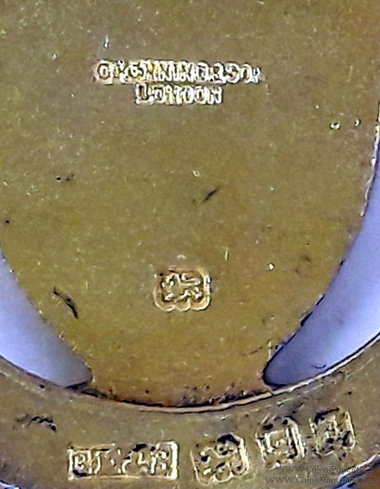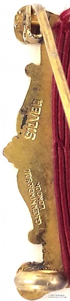 Лента знака красная. Верхняя колодка в форме ленты белой эмали с надписью STEWARD и булавкой для носки с обратной стороны. Знак в оригинальной коробке с клеймом производителя на внутренней поверхности крышки.