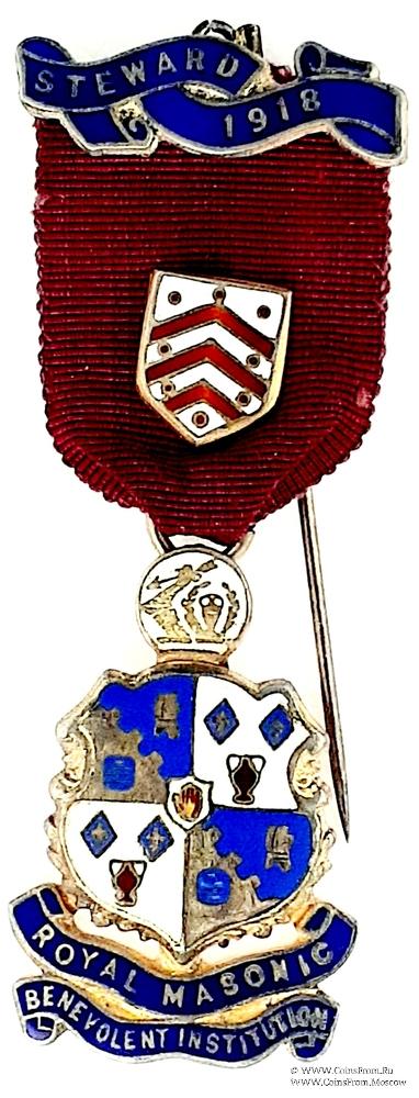КОЛОДКИ/МЕДАЛЬОН: верхняя колодка в виде витой ленты с надписью - Steward 1918. На ленте медальон в форме щита с тремя «стропилами» (геральд.) и 8 кругами. Игла для ношения.