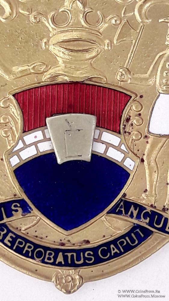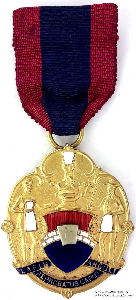 В центре знака в белой арке золотой проём под замковый камень на трёхцветном щите, сверху увенчанным шлемом рыцаря и короной, над которой в ладони замковый камень белой эмали. На центральном замковом камне, расположенном на трёхцветном щите, выгравирована "Метка" Брата. По бокам щита два масона в запонах белой эмали. Левый держит на ладони правой руки замковый камень белой эмали. Правый – в правой руке держит поднятый топор. В низу знака на ленте синей эмали надпись на латыни: LAPIS REPROBATUS CAPUT ANGULI (он есть) камень, пренебреженный вами зиждущими, но сделавшийся главою угла.
