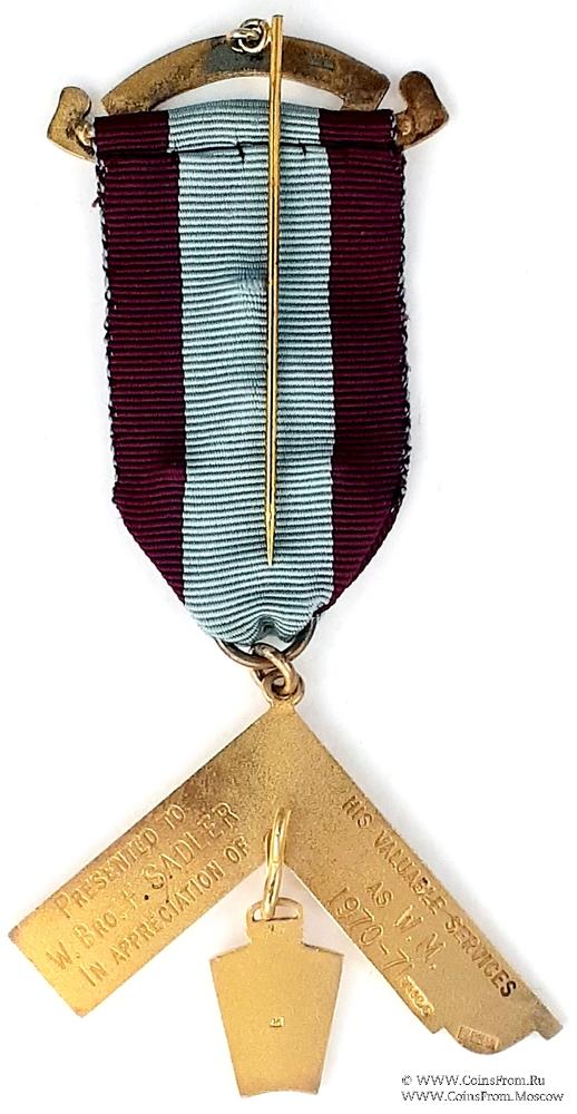 РЕВЕРС: клейма: на наугольнике: TK&S, якорь, лев, w (1971). На подвеске – лев, на верхней колодке - лев, w. Гравировка: Presented to Bro. F. Sadler in Appreciation of his Valuable Services as W.M. 1970-71.