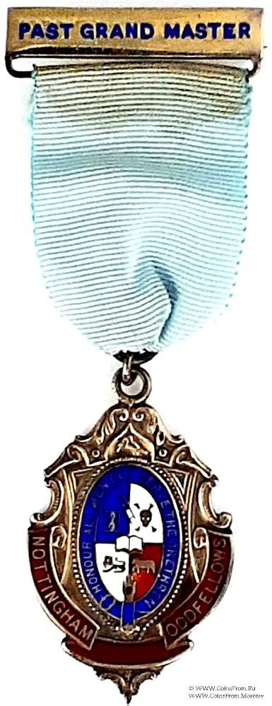АВЕРС: украшенное резьбой основание с овалов в центре. Овал, образованный подвязкой синей эмали с надписью: Honour All Men But Serve the Brethren - Почитай всех людей но служи братьям. Внутренняя часть овала разделена на четыре «поля» - два белых, одно красное и одно синее. На вертикальной инии деления полей размещены изображения: вверху – лестницы, в центре – раскрытой книги (библии), в нижней части ладонь с сердцем (символ Ордена). На синем поле – песочные часы, на красном – агнец, на белом верхнем – череп и кости, на нижнем – лев. По нижнему краю знака размещена лента красной эмали с надписью Nottingham ODDFellows.