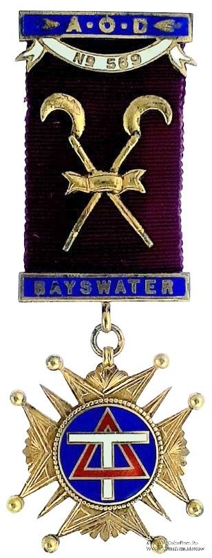 КОЛОДКИ/МЕДАЛЬОН: верхняя и нижняя колодки прямоугольные синей эмали. На верхней колодке аббревиатура Ордена A.O.D., на дополнительной ленте номер Ложи. На нижней колодке наименование Ложи. На ленте медальон в виде изображения пересекающихся болинов.