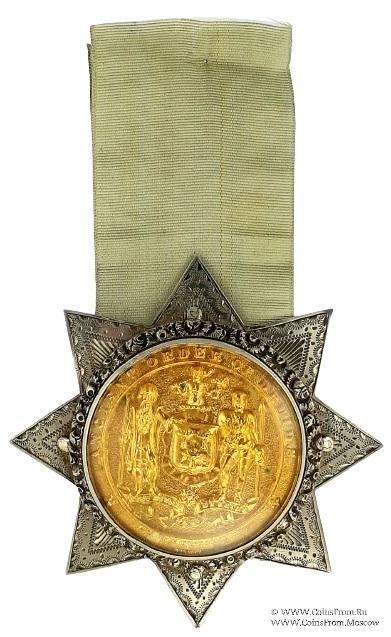 АВЕРС: восьмиконечная звезда, украшенная ручной резьбой и чеканкой по серебру. Накладная круглая оправа, украшенная орнаментом, удерживает золотую вставку с гербом Ордена, закрытую стеклом. На гербе Ордена в центре щит с тремя дубами. Правый (геральд.) щитодержатель -бородатый друид в плаще с посохом. Левый (геральд.) щитодержатель – воин со щитом, копьём и мечом, держащий отрубленную голову. Сверху щита на бурелете клейнод в виде фигуры друида с дубиной в одной руке, в другой руке он держит символическое дерево. В нижней части герба девизная лента, которая служит подножием для щитодержателей. Надпись на ленте: Dieu Notre pays et Reine. Вокруг герба наименование Ордена: Ancient Order of Druids.