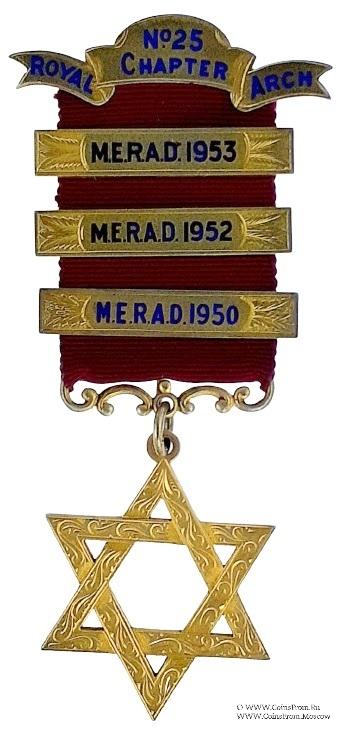 КОЛОДКИ/МЕДАЛЬОН: верхняя колодка в виде ленты с номером Капитула: Royal Arch, Chapter № 25. Нижняя колодка резная. На ленте 3 прямоугольных медальона, украшенных гравировкой и с надписью: MERAD 1953, 1952, 1950.