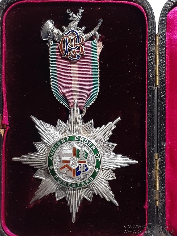 Аверс: в форме двух наложенных друг на друга восьмиконечных звёзд. В центре выпуклый круг, по краю которого наименование Ордена на зелёном фоне Ancient Order of Foresters, в центре объёмное изображение щита с символами Ордена.