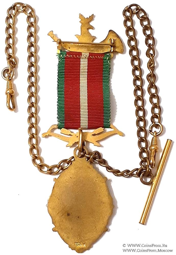 Колодки/медальон: нижняя колодка в форме лука со стрелами. Верхняя колодка в форме охот-ничьего рога со щитом с символами Ордена, на котором голова оленя на короне.